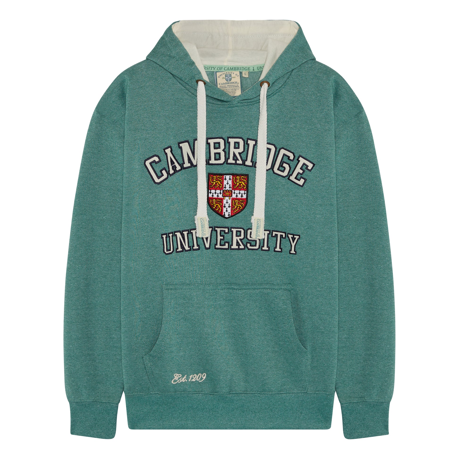 Hooded sweatshirt with the iconic University of Cambridge coat of arms. Green Marl with a cream lining.