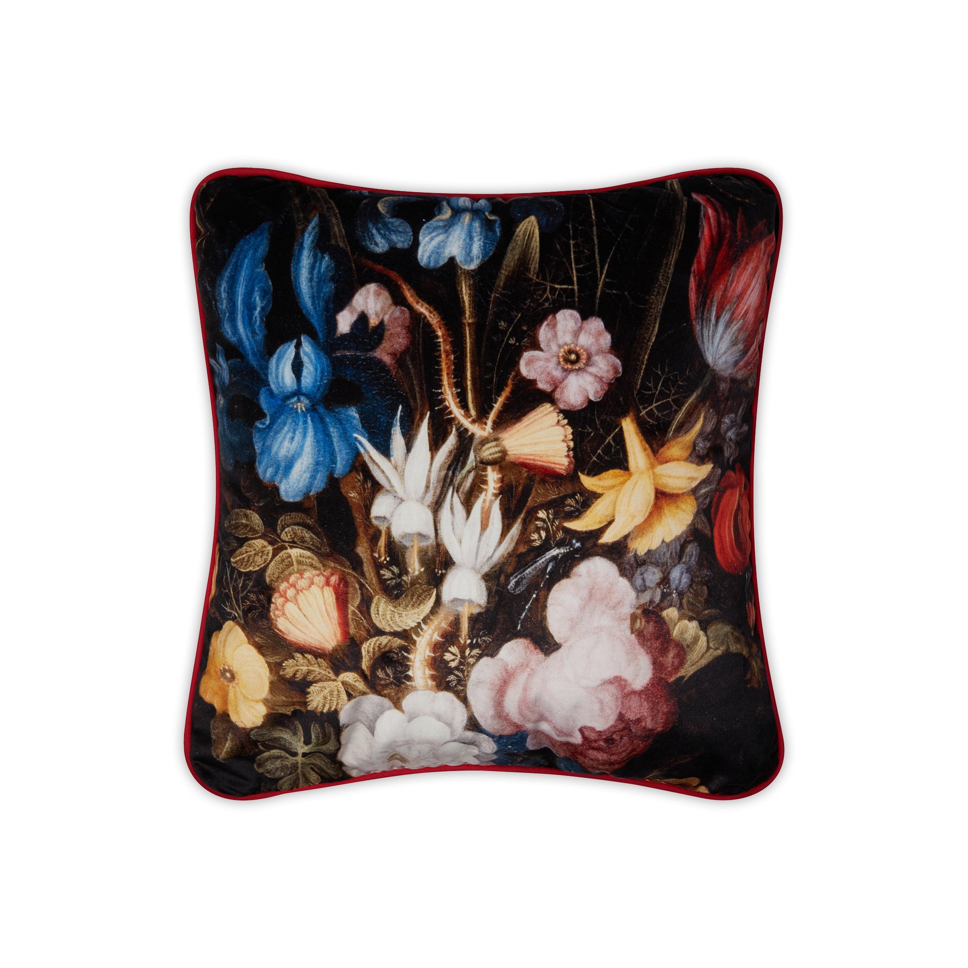 New and exclusive to Curating Cambridge and the Fitzwilliam Museum Courtyard Shop, this velvety cushion encompasses the elegant and luxurious feel of 17th century Dutch still life flower paintings. The red piping adds a striking detail.