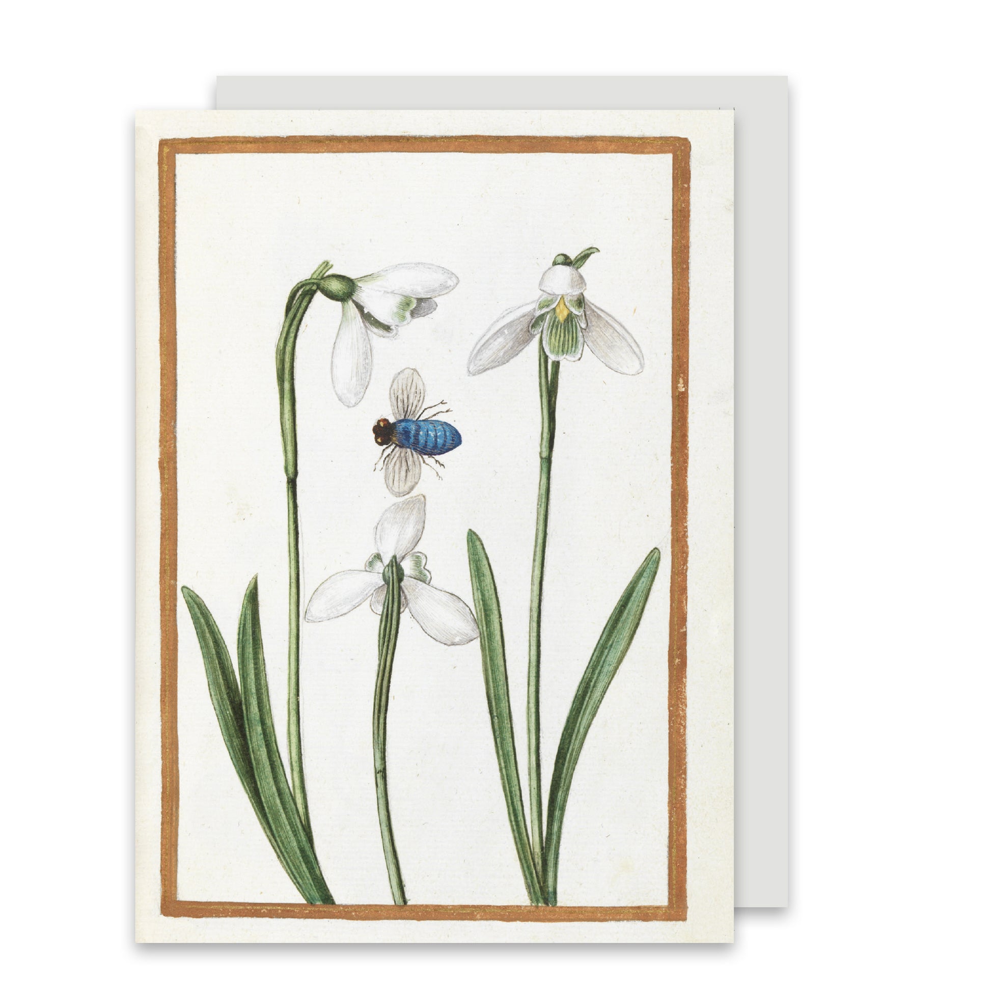 Delicate, carefully observed snowdrops are augmented with the bright blue splash of an insect in this botanical study from French artist Antoine du Pinet.
