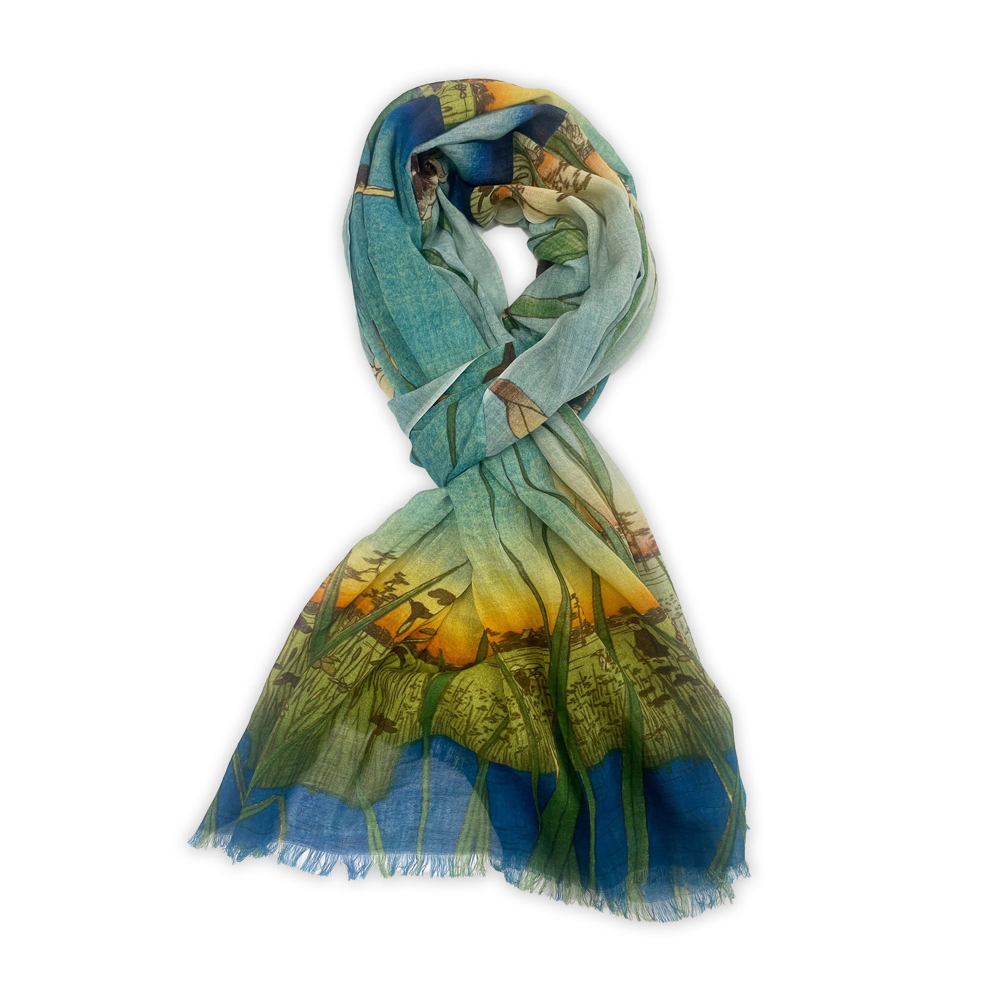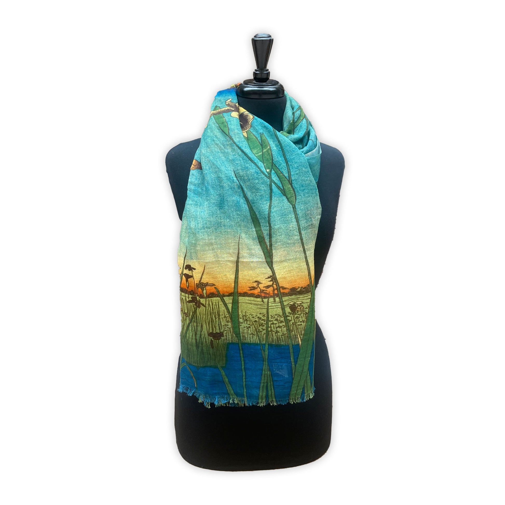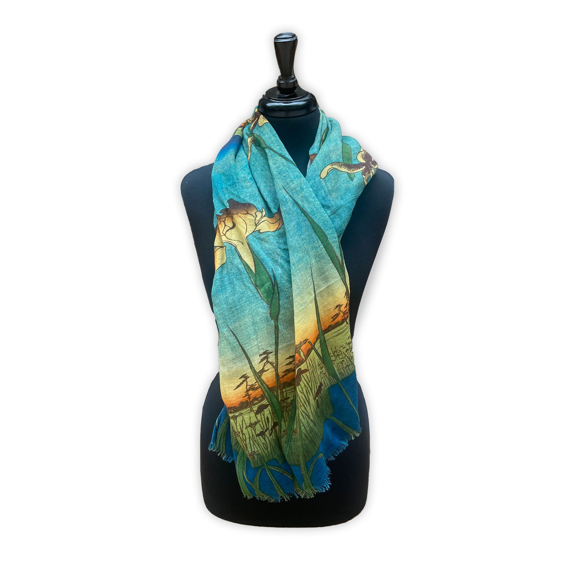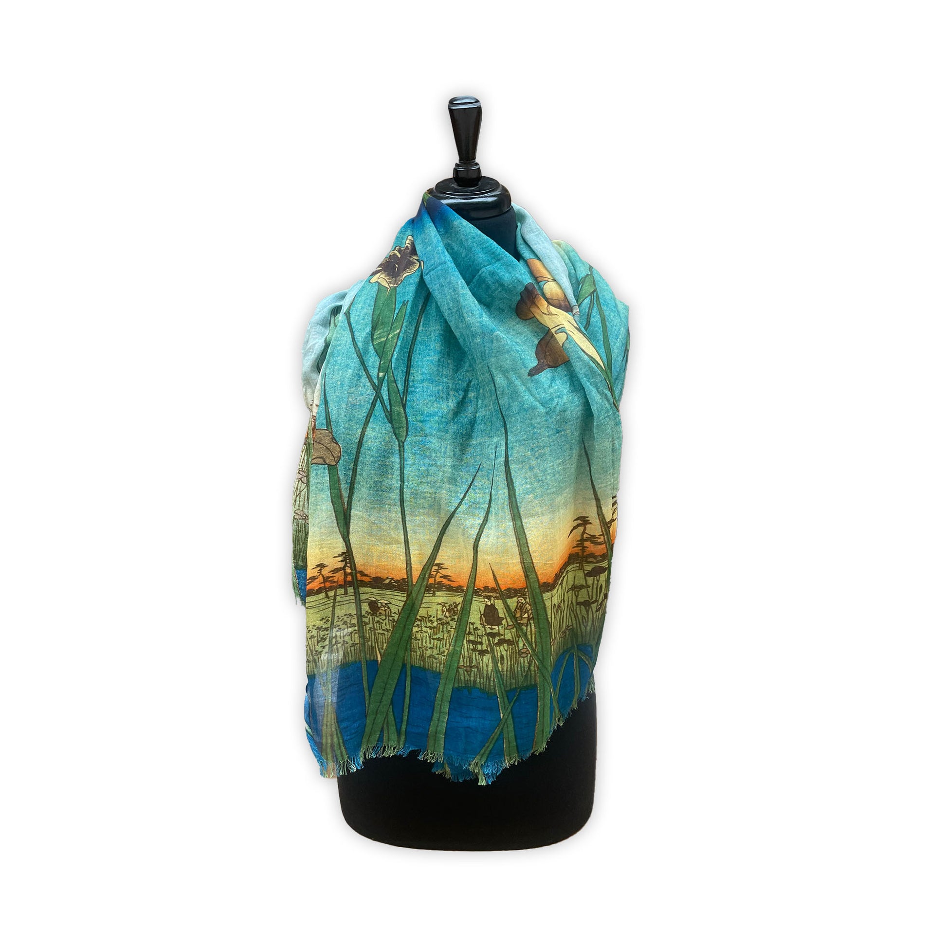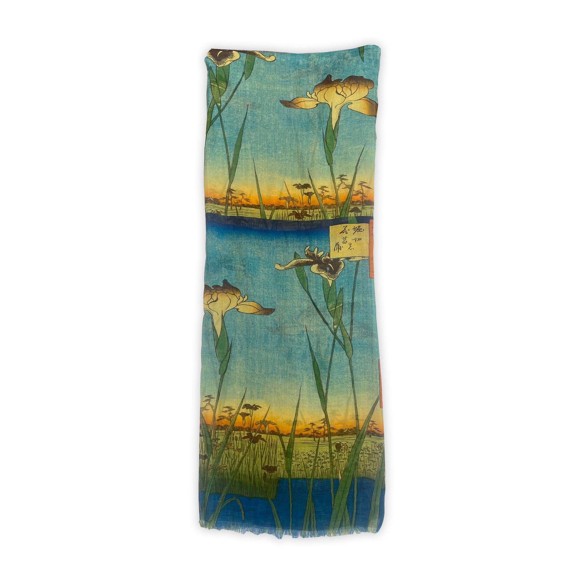 The rich colours of Hiroshige's woodblock print are reproduced with glorious vibrancy on this beautiful scarf It has been designed exclusively for Curating Cambridge and the Fitzwilliam Museum.