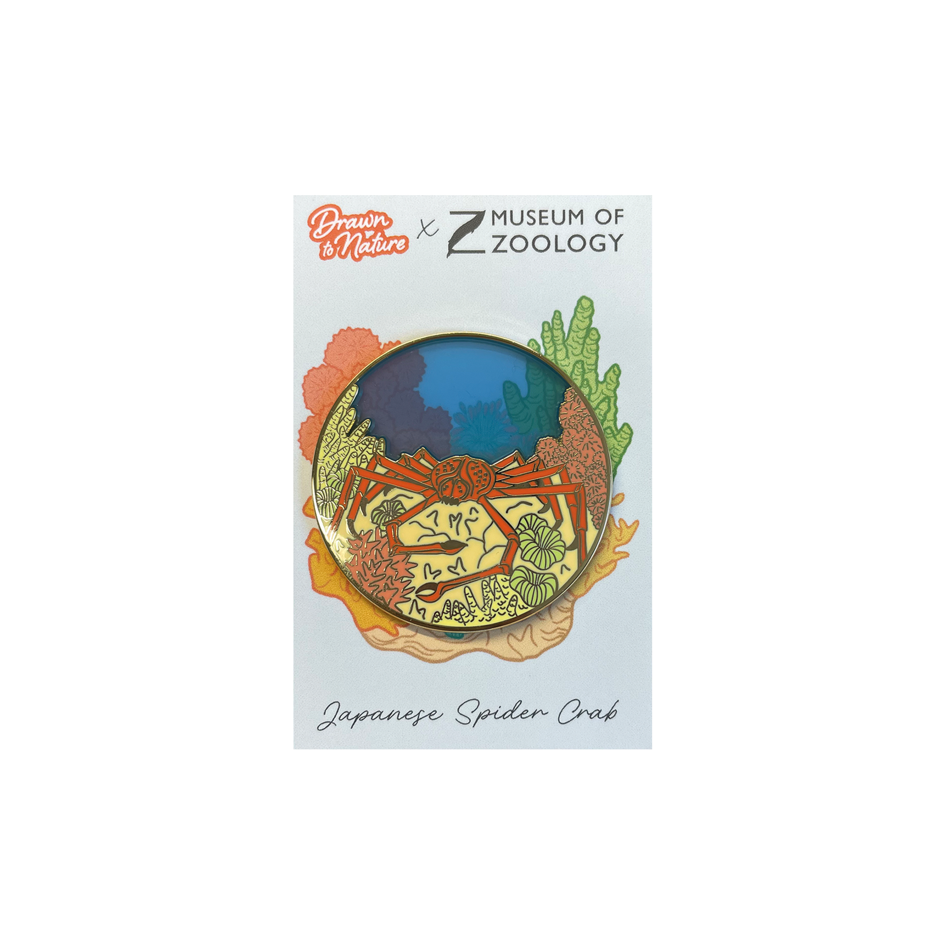 This brooch is made from enamel and acrylic. It features a Japanese Spider Crab, one of the most popular specimens on display at the University Museum of Zoology in Cambridge.