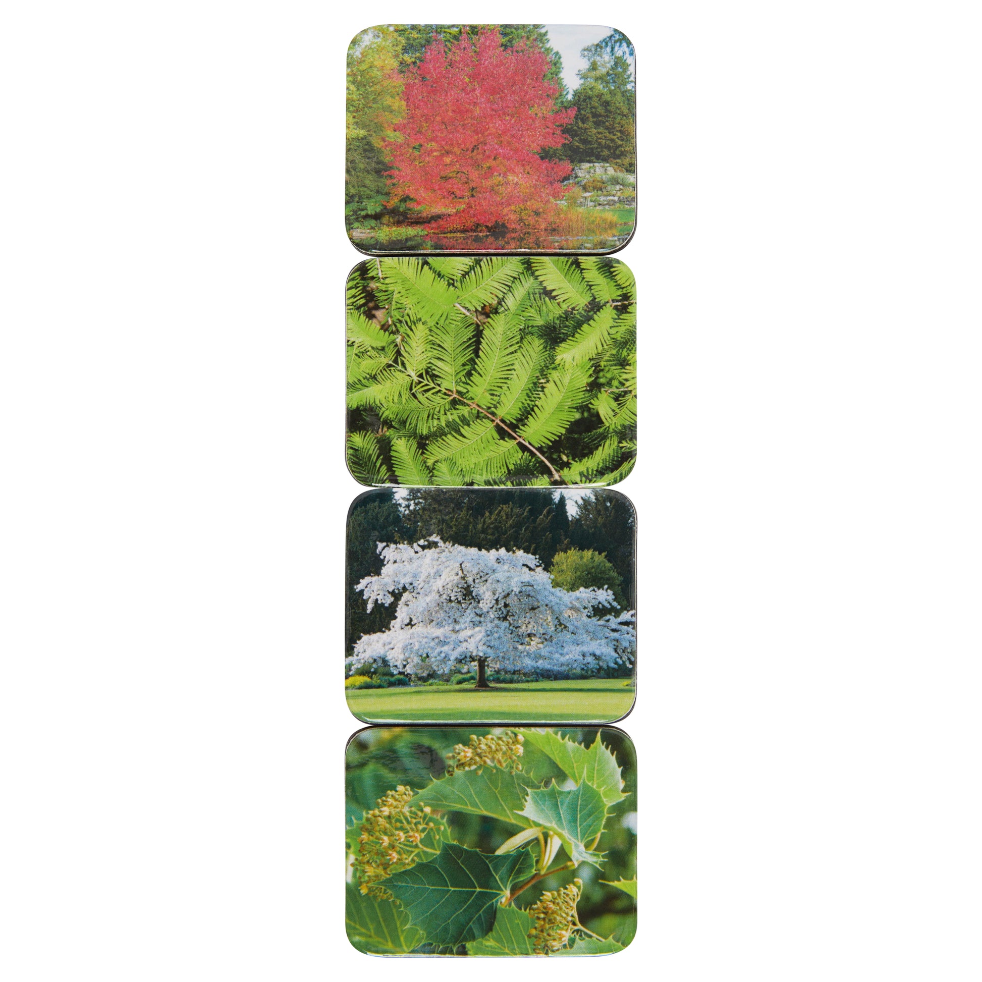 This magnet set features photography of four of the 'hero trees' of Cambridge University Botanic Garden: the Dawn Redwood (Metasequoia glyptostroboides), Common Lime (Tilia europaea), Yoshino Cherry (Prunus x yedoensis), and American Sweetgum (Liquidambar styraciflua).