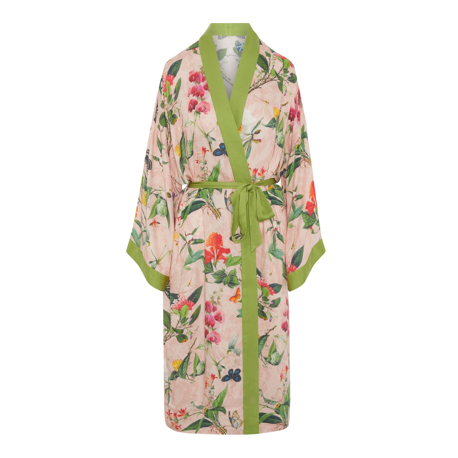 A stunning kimono style gown in a pleasing pink with stylish lime trim, decorated with a print inspired by the botanical studies of Princess Louise d'Orleans. Princess Louise (1812-50) was an accomplished watercolourist who produced many beautifully detailed paintings of flora and fauna. The Fitzwilliam Museum was gifted several of her works as part of the Broughton bequest in 1973. This gown has a soft, satiny finish, and drapes wonderfully.