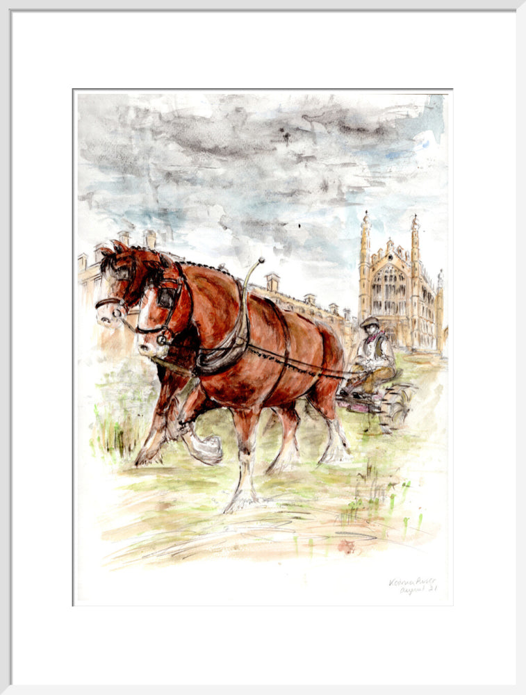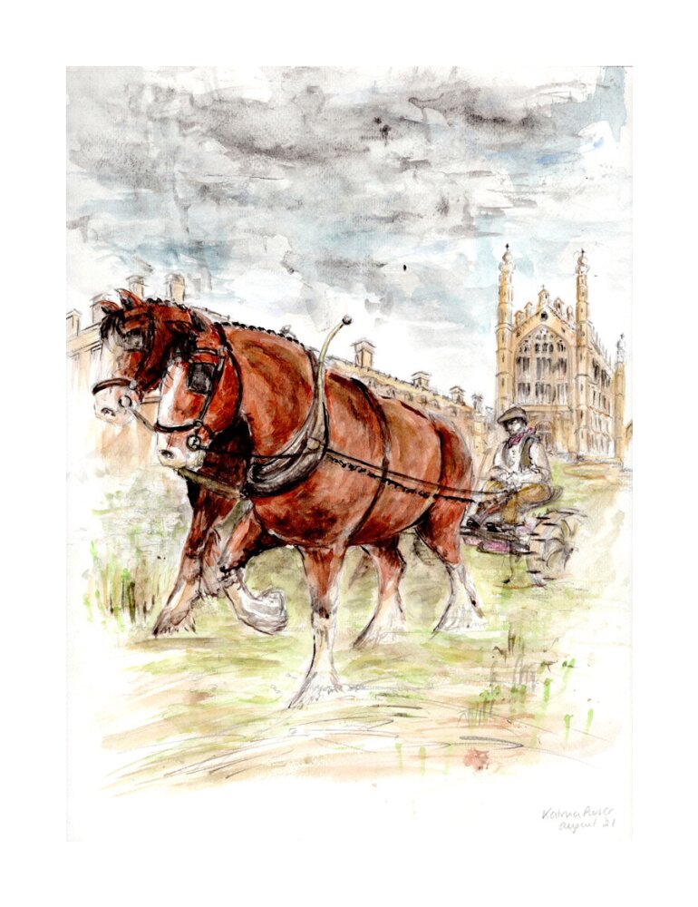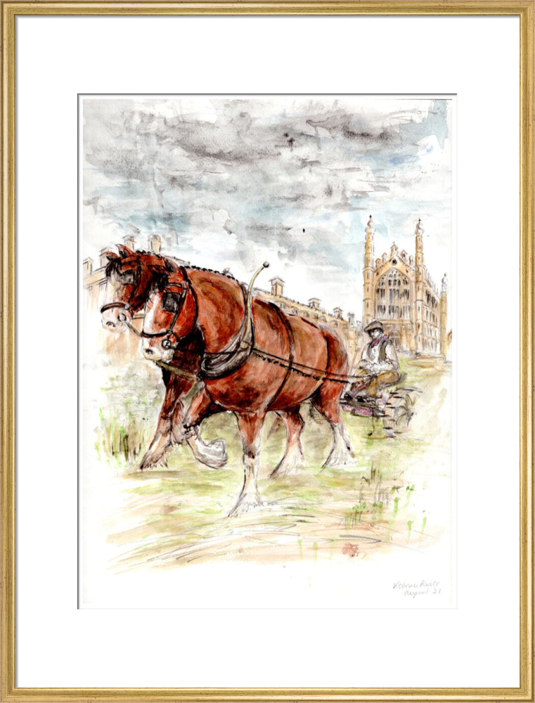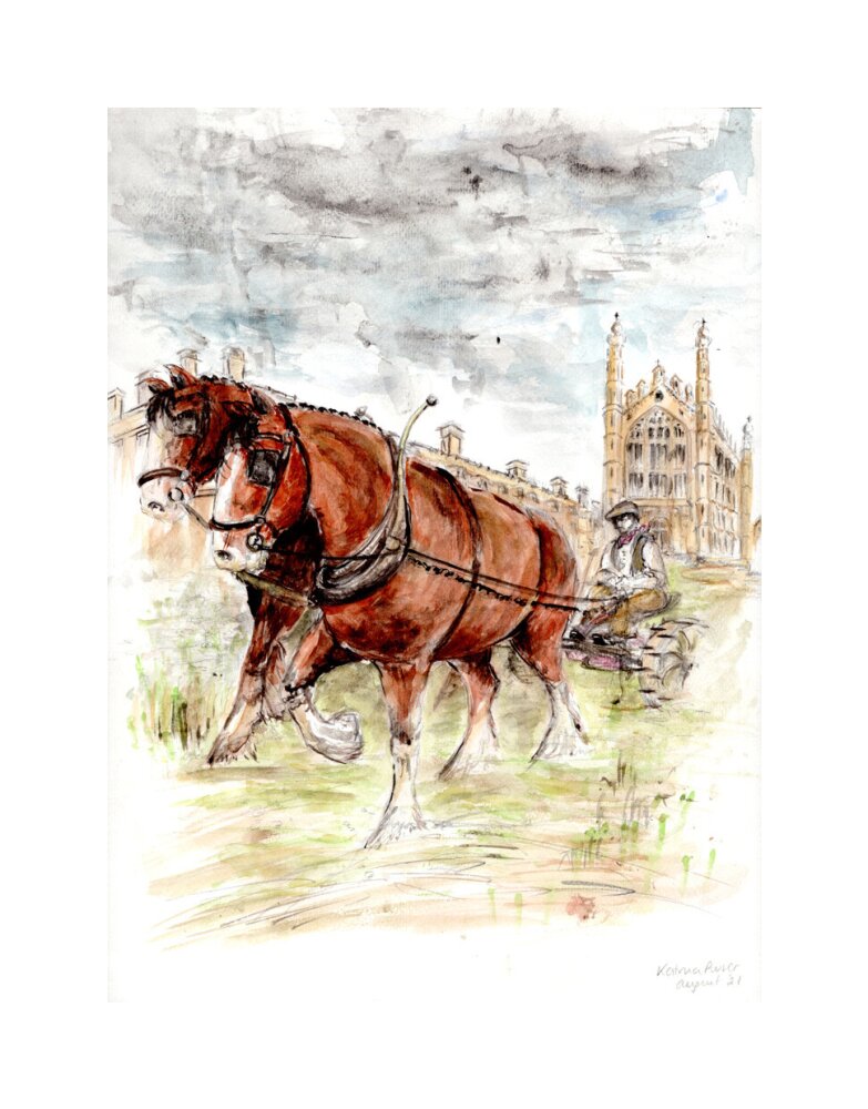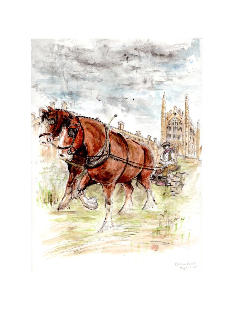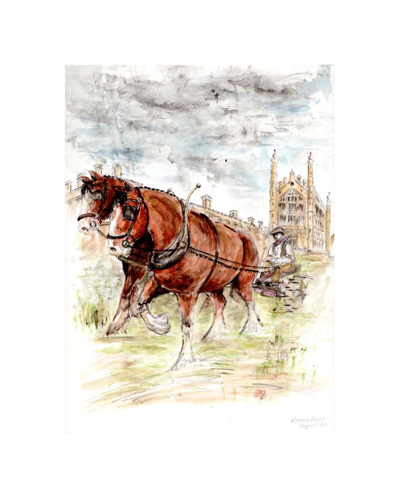 King's College Cambridge, Cutting the Wild Flower Meadow with Heavy Horses by Katrina Purser