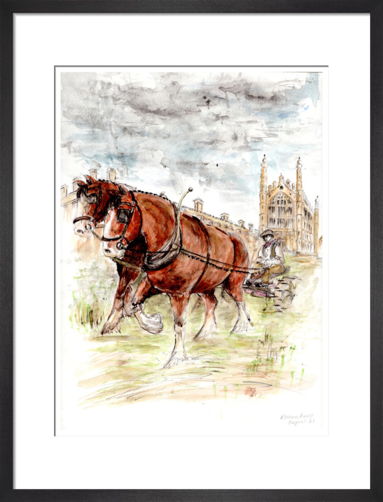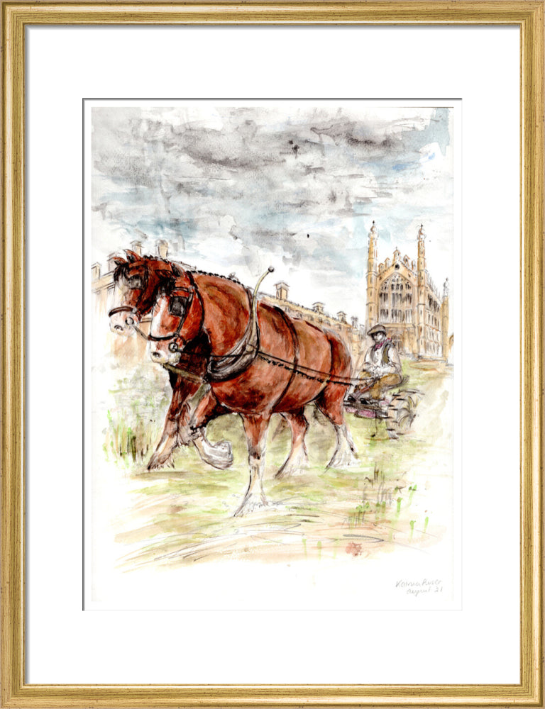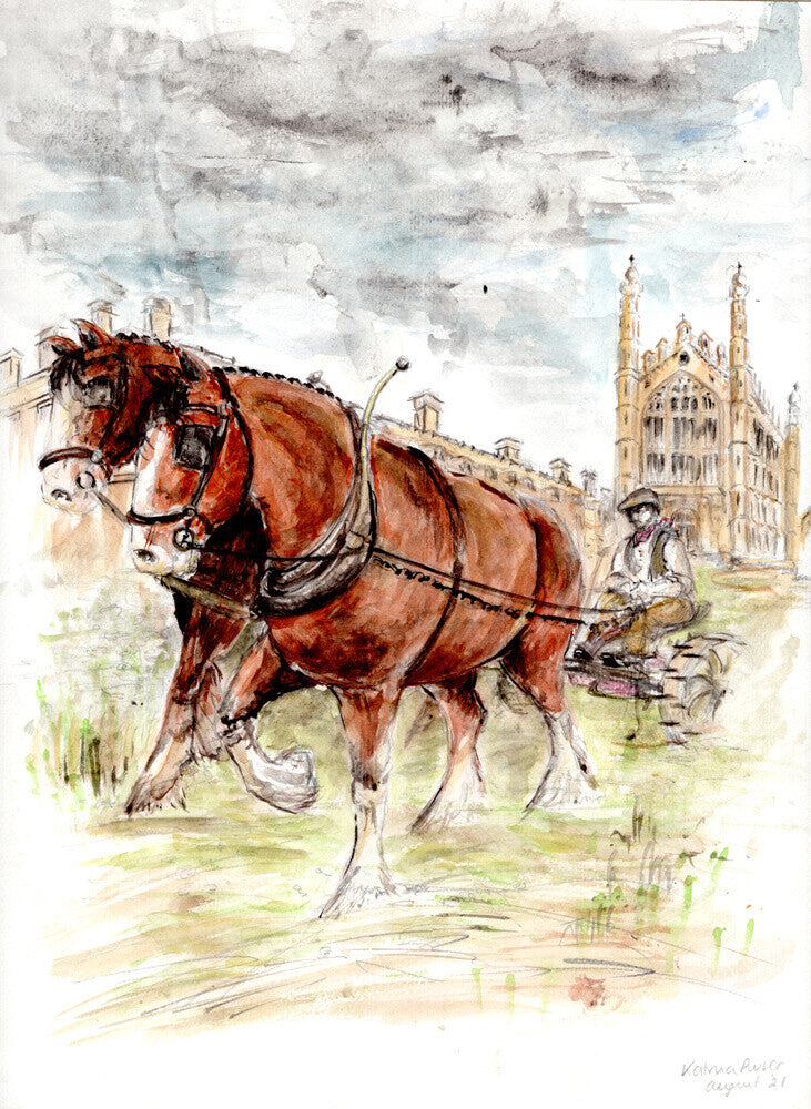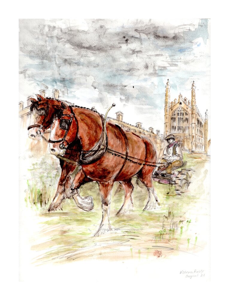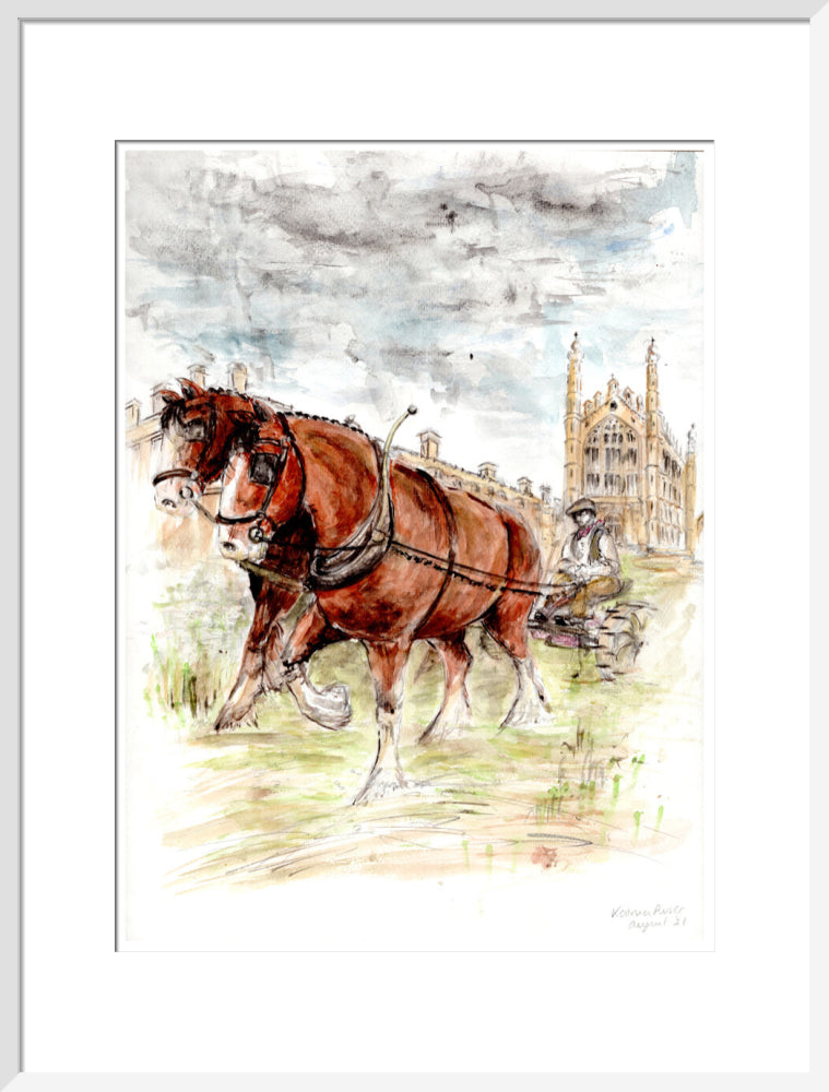 King's College Cambridge, Cutting the Wild Flower Meadow with Heavy Horses by Katrina Purser