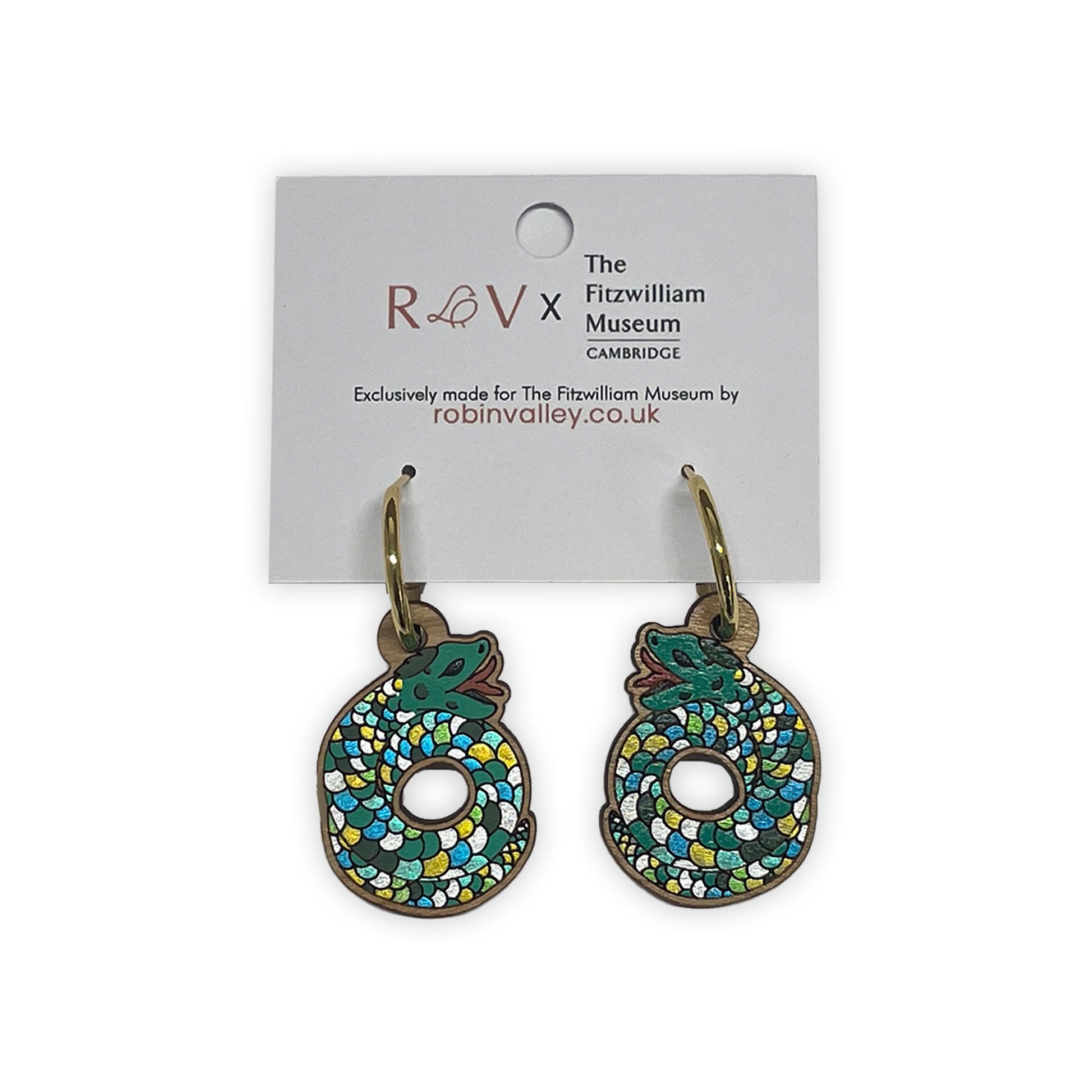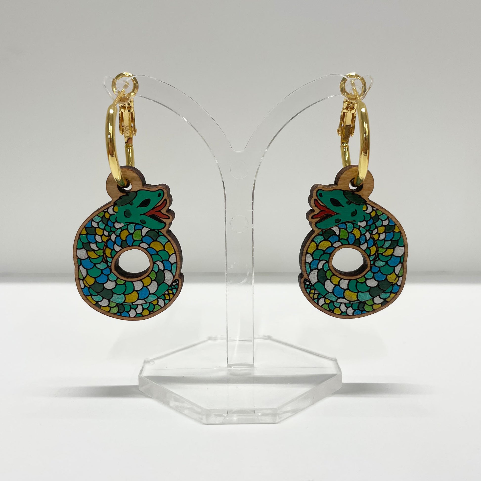 Hand-painted wooden earrings inspired by serpents from William Blake's book Europe A Prophecy.