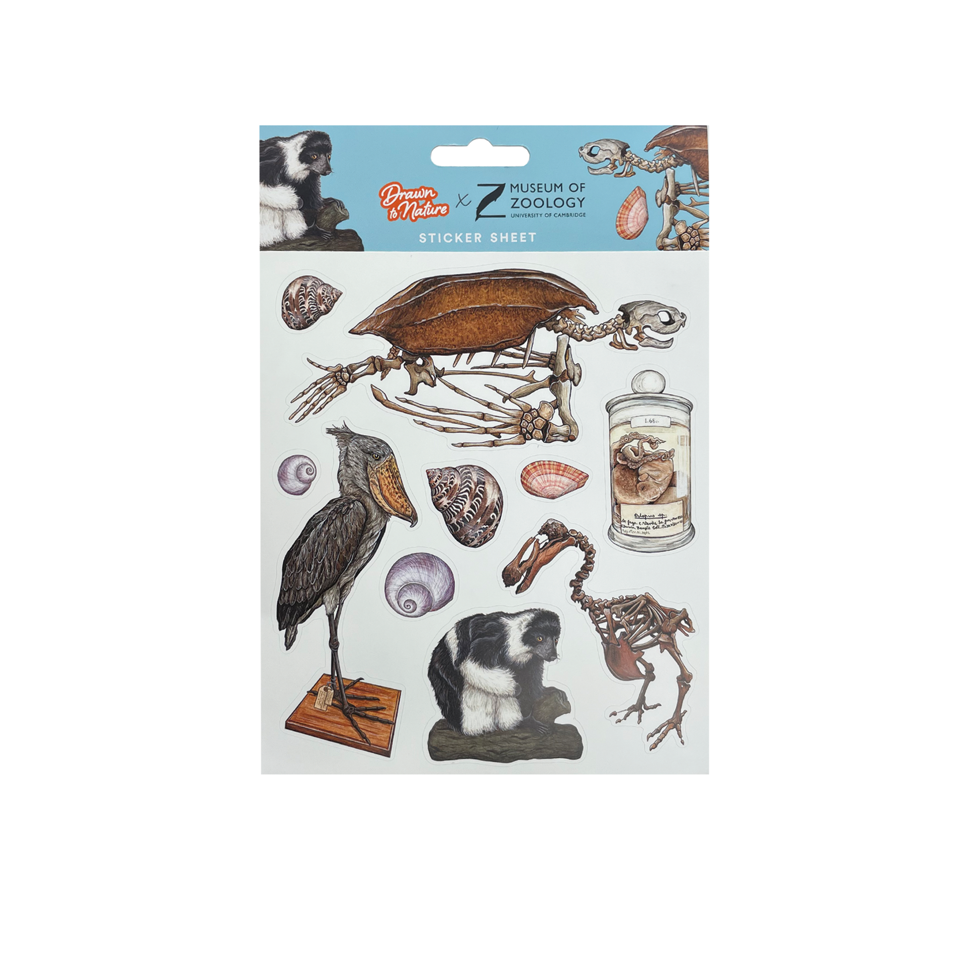 Sticker sheet featuring illustrations of animals and specimens from the Museum of Zoology collection.